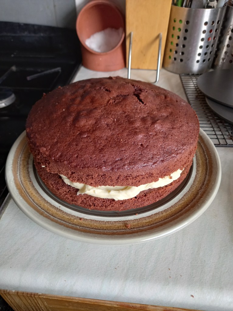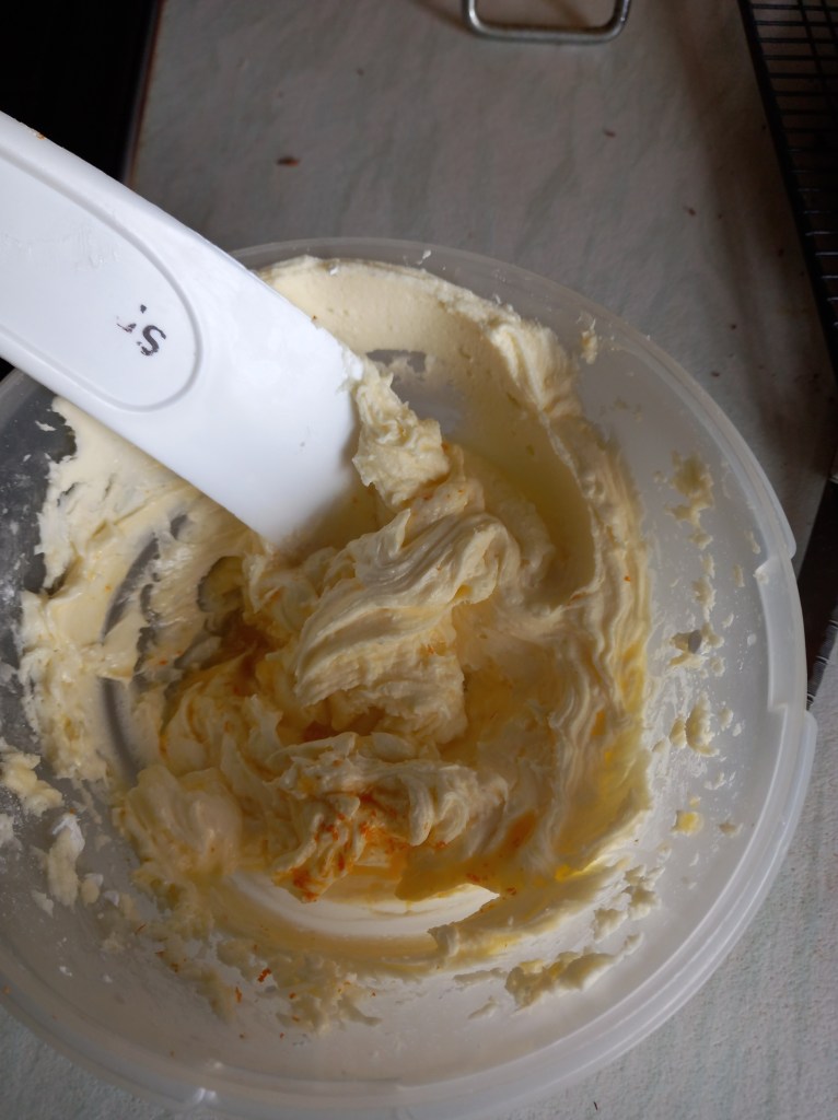 As with the first cake, I prepared a buttercream filling. I use unsalted butter in baking, both for the cake and for its filling. I added a little more orange zest and a few spoonfuls of orange juice (see photo). If I’d had some orange food colouring, I think I would have added that as well.