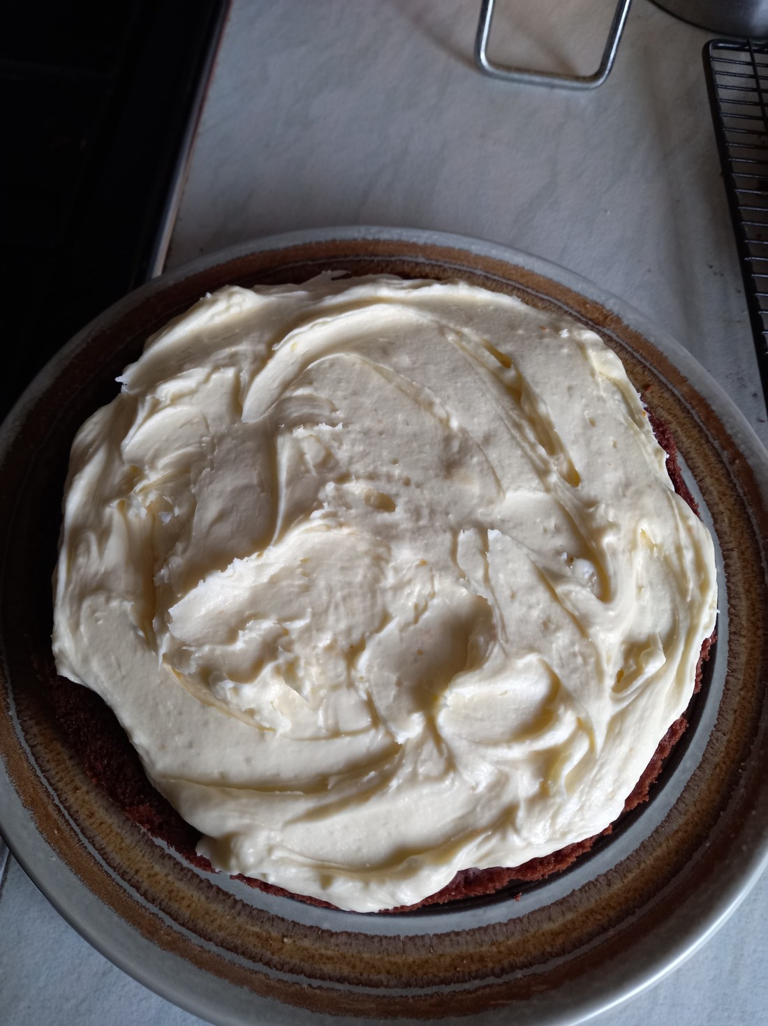 As with the first cake, I prepared a buttercream filling. I use unsalted butter in baking, both for the cake and for its filling. I added a little more orange zest and a few spoonfuls of orange juice (see photo). If I’d had some orange food colouring, I think I would have added that as well.